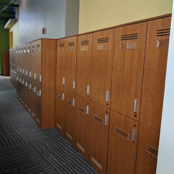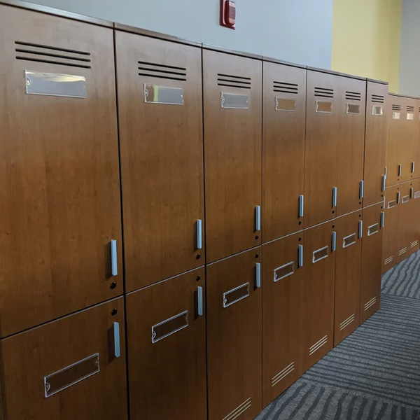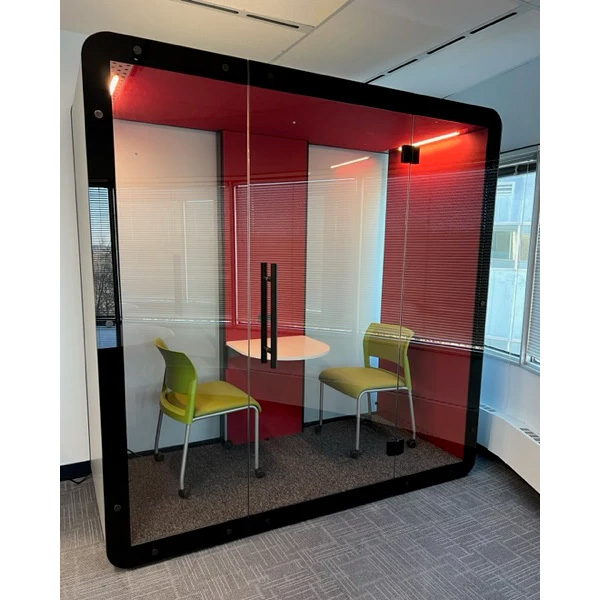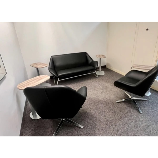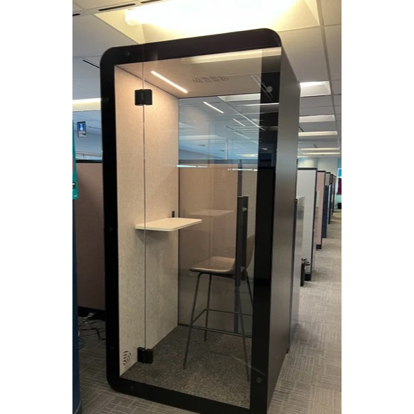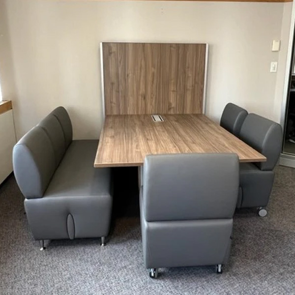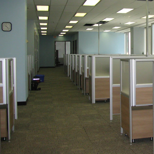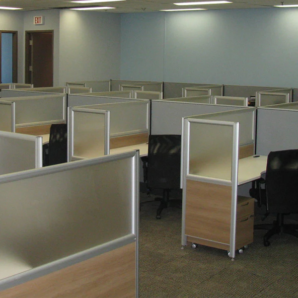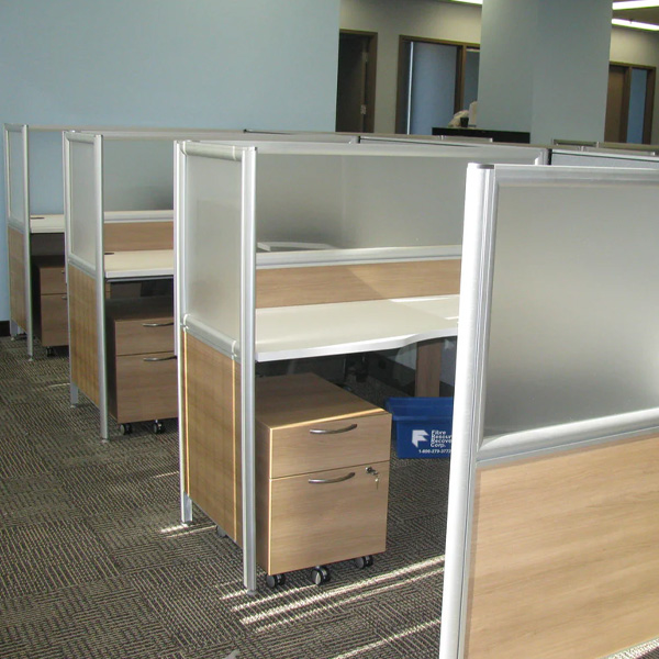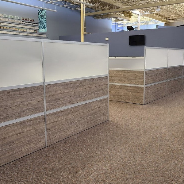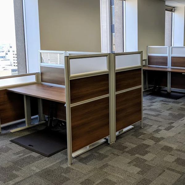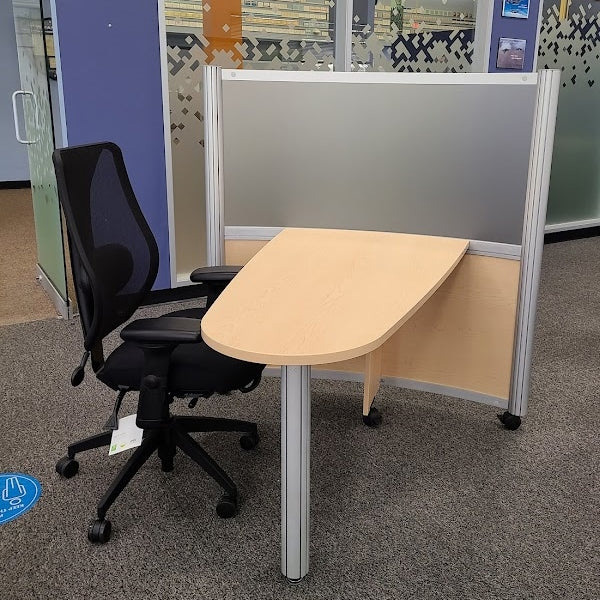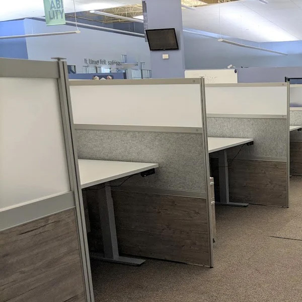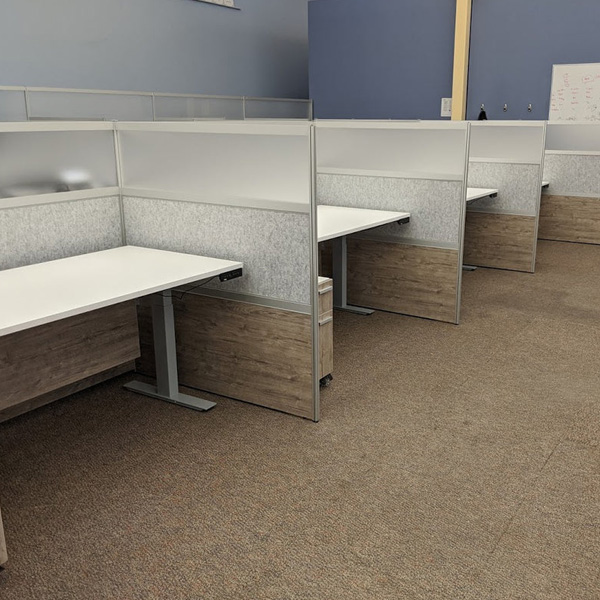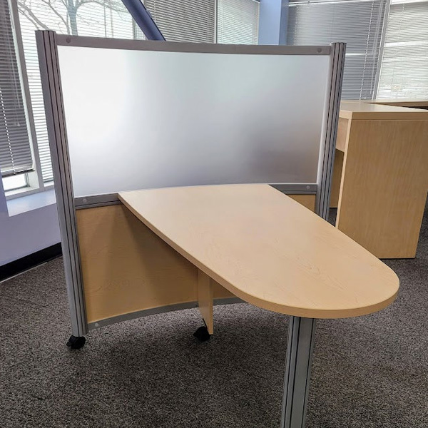 Featuring Fluid Concepts panels with laminate lower portion, sound absorbing Soft Scape middle and frosted acrylic top. Includes height adjustable tables and mobile pedestals.